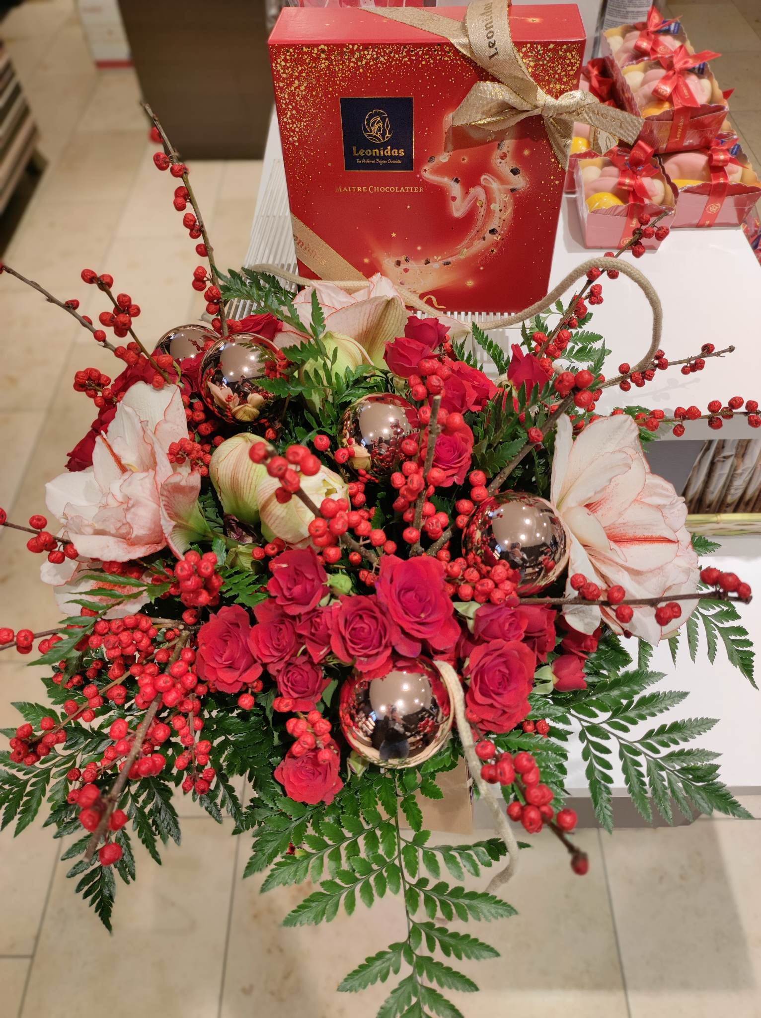 un bouquet de Noël et un coffret de 20 pralines Leonidas