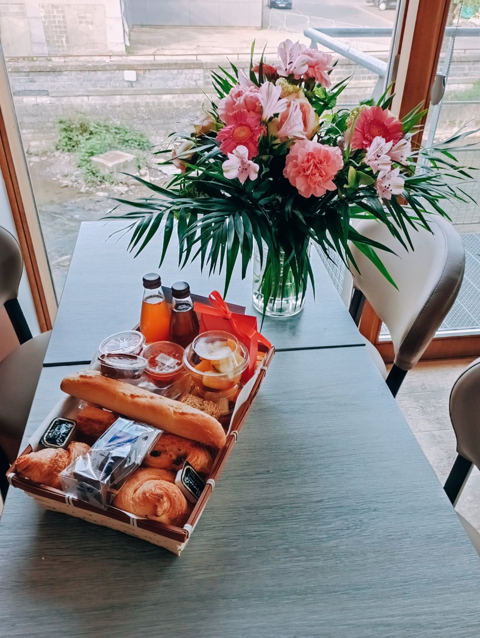 • un pain au chocolat, une crêpe, pâte à tartiner Leonidas, chocolat chaud Leonidas